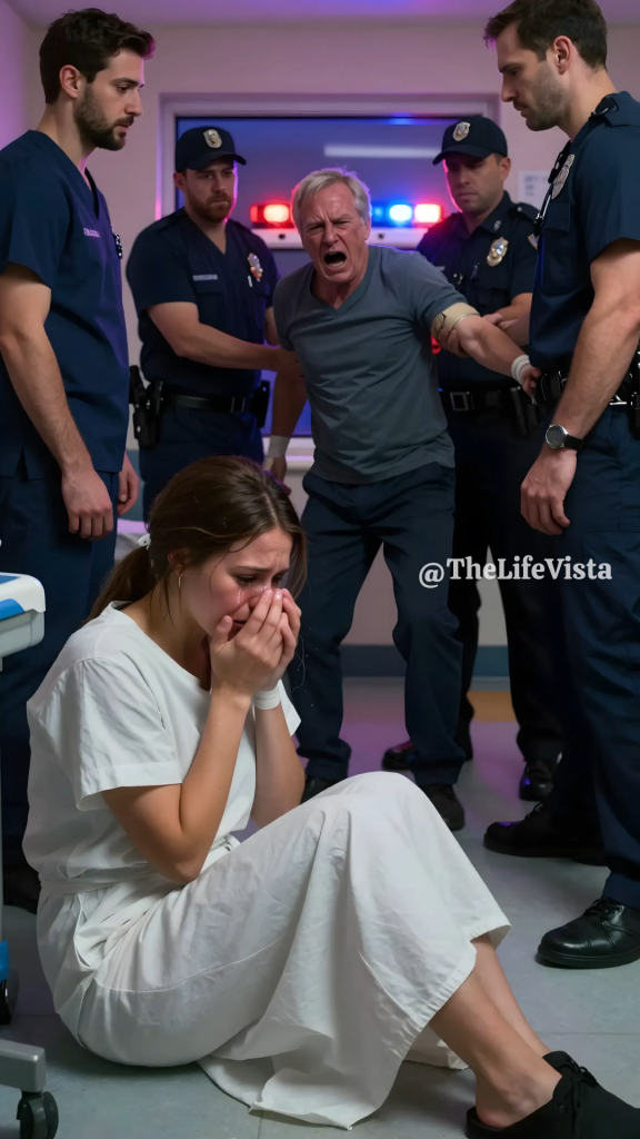 When security burst in, followed by two police officers who had been nearby for an unrelated call, they stopped short, their expressions shifting rapidly from confusion to disbelief as they took in the scene: a grown man rigid with fury, a woman in a hospital gown curled on the floor clutching her face, bl00d seeping near stitches that should never have been strained.