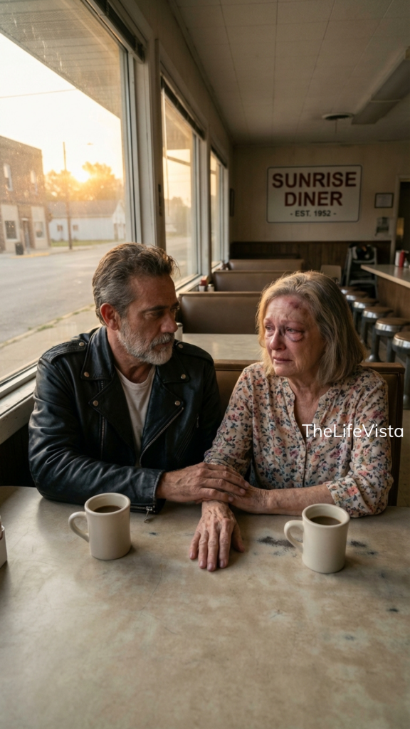 What caught his attention wasn’t the woman herself. It was her eye. The left one was swollen, nearly shut, the skin around it a violent palette of purple and black and sickly yellow. The kind of bruise that didn’t come from a fall, the kind that came from a fist. The woman moved to a booth in the far corner, head down, shoulders curved inward like she was trying to make herself invisible.