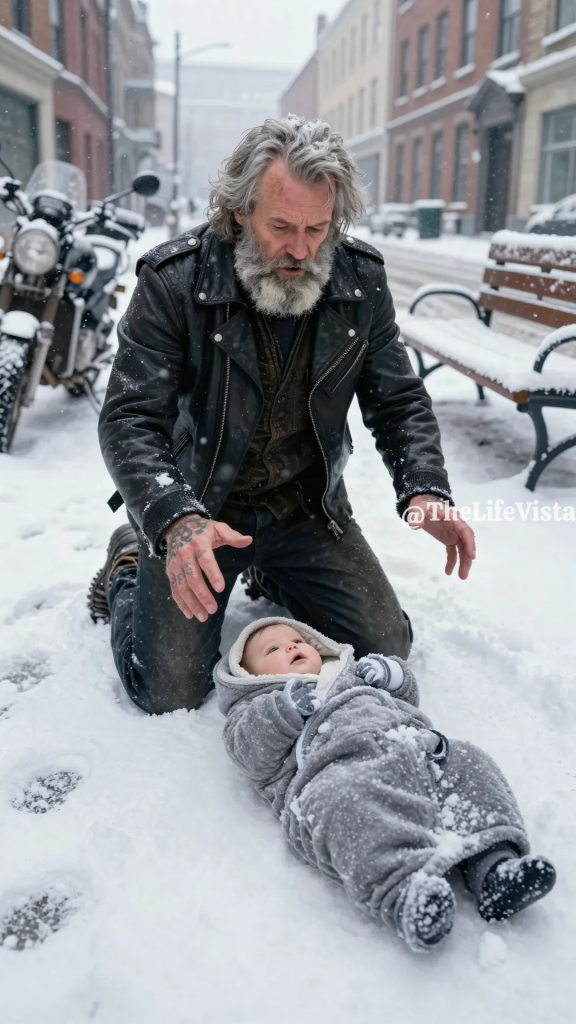 The winter wind whistled through the bare trees as Gage Rawlins guided his Harley along the curved path of Maple Grove Park, and even though his leather jacket and thick gloves were built for weather like this, the cold still found its way in through seams and breath and the thin places you don’t notice until you stop moving. He didn’t stop moving much. Night rides were his ritual, his way of draining the noise out of his head after long days at the garage, and the steady rumble under him had always been the one thing that never lied. Snowflakes danced in his headlight beam like restless sparks, his breath came out in pale bursts beneath a salt-and-pepper beard, and the park sat empty the way he liked it, with no parents steering their kids away, no judgment hiding behind polite faces, no whispers about the tattooed man on the loud motorcycle as if a man on two wheels couldn’t also be a man trying to stay alive inside his own skin. The tires hissed over thin snow, the engine echoed off the frozen ground, and when Gage rounded the bend toward the central playground, he heard something that didn’t belong in an empty park, a sound so small it felt impossible against all that dark and cold, a soft whimper carried on the wind like the park itself had learned how to beg.