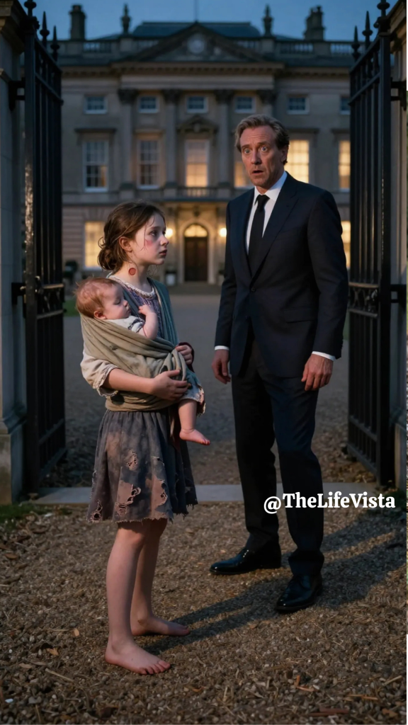 The iron gates of the Rothwell estate were already sliding open when a thin, desperate voice cut through the evening air and brought Julian Rothwell to an abrupt halt, his polished shoes frozen against the gravel as the city’s distant hum faded from his awareness. He had spent the entire day moving between meetings, contracts, and conversations that revolved around numbers so large they no longer felt real, and his mind was still half-locked in that world when the words reached him again, trembling yet stubborn, asking if he needed a maid, if he needed help with anything at all, because the girl’s little sister was hungry and she had nowhere else to go. Julian turned slowly, irritation ready on his tongue, only to find himself staring at a sight so jarringly out of place against the manicured hedges and stone façade of his London mansion that his thoughts scattered. The girl could not have been more than eighteen, her dress torn and dulled by layers of grime, her hair pulled back in a careless knot that did nothing to hide the exhaustion etched into her face, and strapped securely against her back was a sleeping infant wrapped in a cloth so faded it looked as though it had once belonged to another life entirely. The baby’s chest rose and fell in shallow, fragile breaths, and the girl’s hands hovered protectively near her as if the world itself were something that might reach out and steal her away.