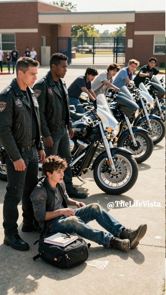 From that moment, the course of Eli’s day and his life shifted in ways he could feel even before he fully understood them, because the bikers did not leave him standing there but escorted him straight to the school office, where security footage played back the truth without commentary and stripped every excuse down to nothing. Administrators watched, faces tightening, and the bravado of the boys collapsed under the weight of undeniable evidence, leading to suspensions that replaced cruel laughter with a chastened silence throughout the halls. When the final bell rang, the veterans rode with Eli to his house, the sound of engines announcing not intimidation but protection, and when his mother opened the door and saw him standing there safe instead of broken, her relief spilled over into tears as she pulled him into her arms. That evening, laughter returned to a home that had been too quiet for too long, and in the weeks that followed Eli found himself standing taller not because he was feared but because he had learned what respect felt like, choosing to pass it forward by greeting every new student who arrived at Cedar Valley High with kindness and understanding. He never forgot what it felt like to be on the ground while the world looked away, and he carried with him the certainty that when someone finally stood up for him, it changed everything about who he believed he could be.