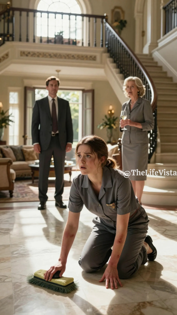 A young woman in a worn gray uniform knelt on the floor, scrubbing the tiles with frantic, repetitive motions. Her shoulders were hunched as if bracing for criticism. Her hands shook from exhaustion. I opened my mouth to greet her politely, assuming she was a housekeeper Denise had hired.