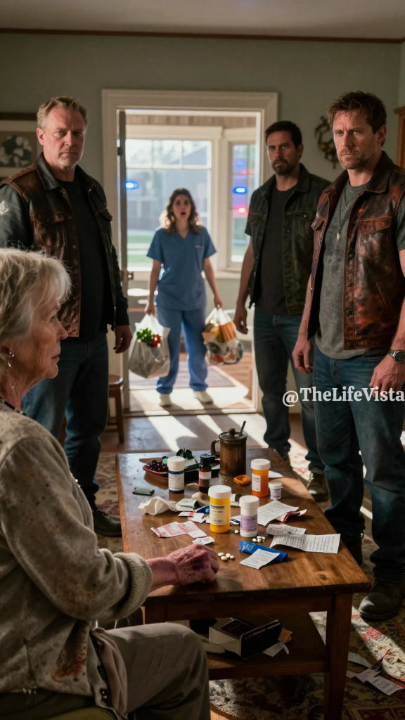 Inside, the air smelled stale, like curtains that never opened. The riders didn’t rummage recklessly. They moved with method. Switch photographed Dorothy’s bruises with careful angles and time stamps. Another man checked the kitchen counter where pill bottles sat lined up like obedience. Switch opened one bottle and shook tablets into his palm, his expression tightening when he saw the wrong shape, the wrong color.