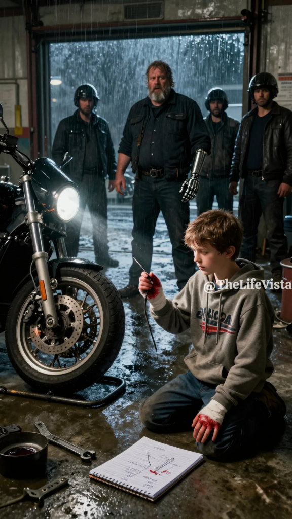 Rain hung over eastern Virginia like a wet curtain, the kind that turns streetlights into blurry halos and makes the world feel empty even when it isn’t. Behind the Tidewater chapter’s clubhouse, a narrow service garage sat dark and still, its corrugated door shut, its windows streaked with grime and old oil. Inside that garage, a small flashlight beam crawled across chrome and black paint, trembling in a child’s hand that was already split in three places. The boy kept working anyway, because stopping meant leaving someone to d!e the way another man had d!ed.