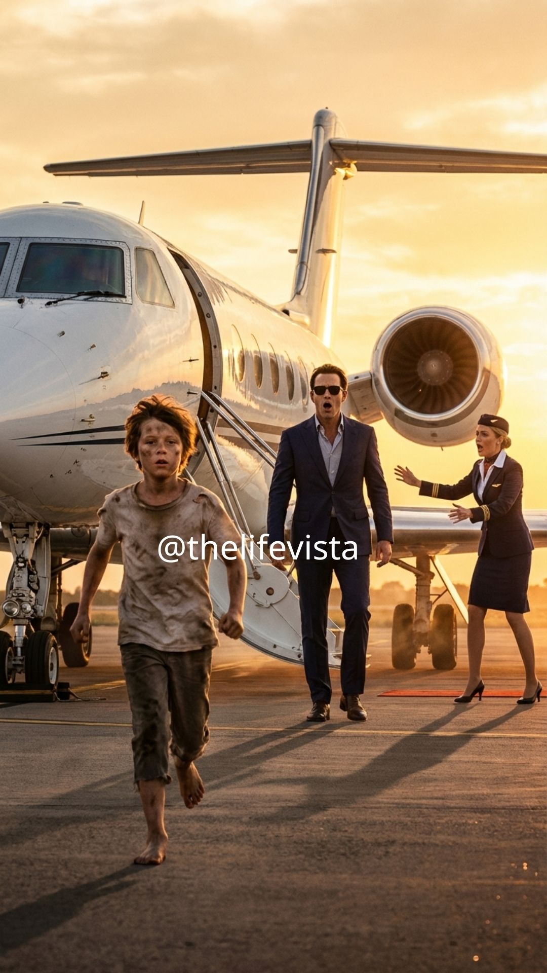 That’s when a small, dirty hand grabbed his sleeve. “Sir—please—don’t board that jet!” The words cracked, half scream, half prayer. Damien Cross froze. The air hostess reacted instantly. She stepped between them, heels clicking sharply against the runway, her face tight with irritation and embarrassment. “Hey! What are you doing?” she snapped, shoving the boy back. “You can’t be here!”