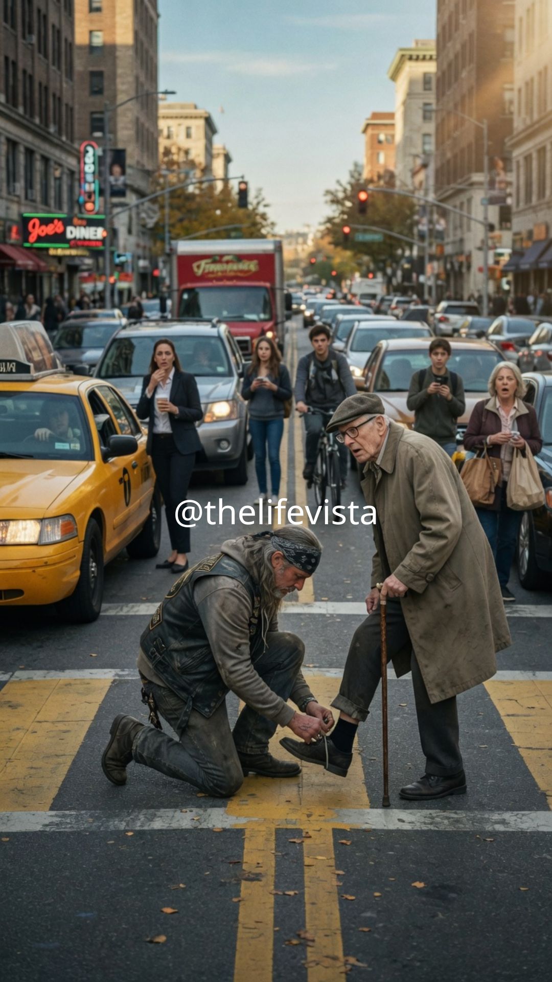 The next day I went back to the intersection at 2:17 PM standing at the same spot watching the same street and sure enough the old man appeared slow careful one step at a time with his shoelace slightly loose again. The biker stepped in with the same movement same silence and same careful hands as I didn’t move didn’t say anything or interrupt because now I understood this wasn’t something meant to be seen and it was something meant to be done. When he finished he stood up turned and for just a second our eyes met with no smile no nod just a brief acknowledgment like he knew I knew then he walked away didn’t look back didn’t wait just left and the old man kept walking like nothing had happened.