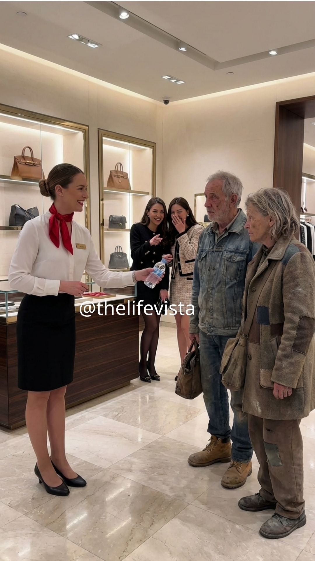 The elderly woman looked at herself in the mirror, and for a brief moment her expression changed. She didn’t look embarrassed. She looked seen, as if the reflection finally included the person she had been all along rather than the labels others tried to attach to her. Alyssa showed them watches, scarves, and handbags, explaining the craftsmanship behind each piece with the calm patience of someone who believed knowledge should be shared, not guarded like a weapon. She never rushed them, never sighed, never looked over her shoulder for a “better” customer, because to her attention was not a currency to be traded.