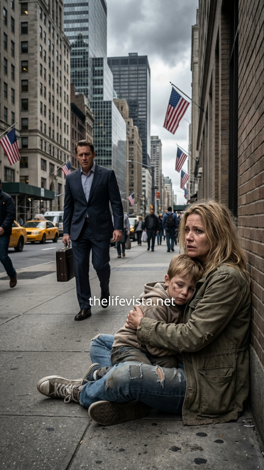 From the corner of his eye, just outside the gleaming entrance of Wexler Towers, he noticed a woman sitting on the pavement. She looked worn and disheveled, her clothing torn and weathered. In her arms she held a young boy, no older than six, wrapped protectively against her chest as though shielding him from the cold concrete and the indifference of the passing crowd.
