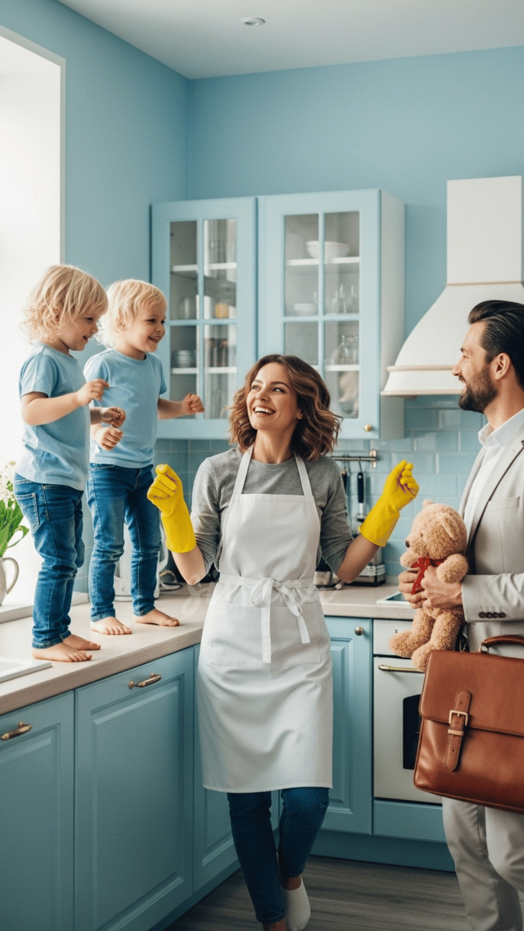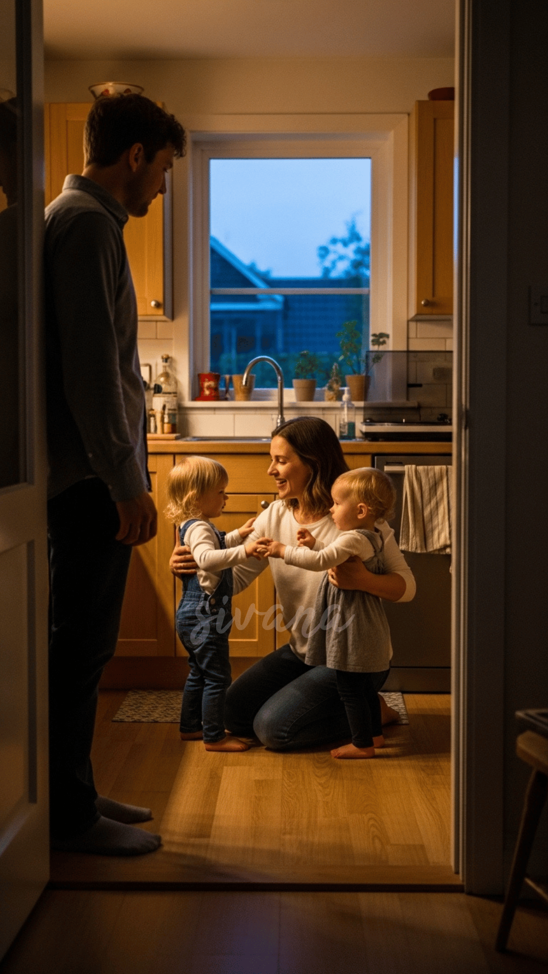 One evening, Andrew came home early and heard soft music coming from the kitchen. When he entered, he froze. Sarah was helping the twins stand—shaky, unsure, but standing.