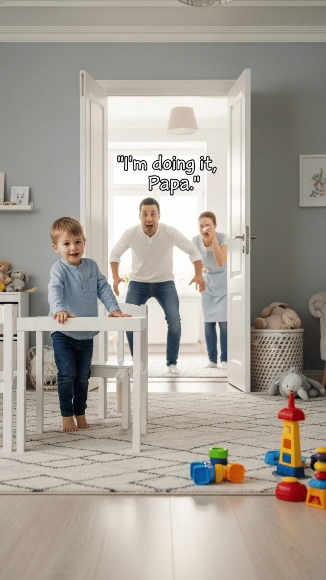 Andrew was reviewing business reports when he heard his sons shouting for him. He rushed to their room to find Ryan standing upright—without help—his tiny hands gripping the edge of a table.
