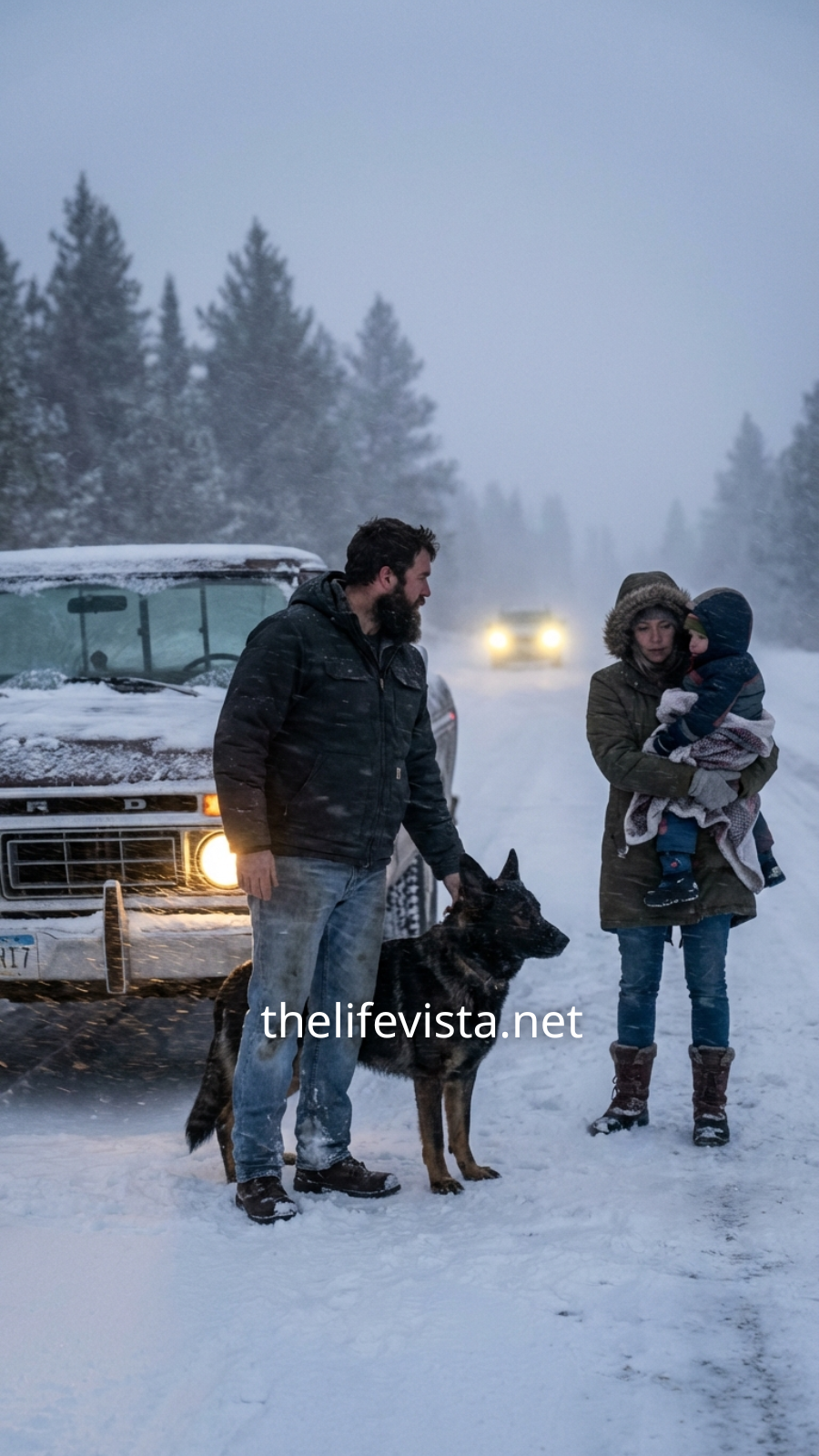 Beside him sat a six-year-old retired military K9 named Ranger, a German Shepherd with sharp ears and steady discipline. Ranger watched the storm like it might suddenly become an enemy. Caleb’s hands trembled on the steering wheel, not from the cold but from memories—rotor blades slicing night air, shouted commands, the echo of things lost. He told himself to keep driving. Home was a small cabin and a silence he could control, a place where nothing surprised him. Pulling over on a blizzard highway was how people got hurt.