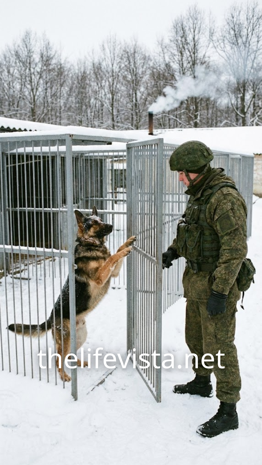 The forest lay blanketed beneath an unbroken sea of white snow, trees stripped bare, and life itself frozen in winter’s merciless grip. In the heart of this stark silence, a German Shepherd stood trapped in a steel cage, abandoned to the cold. His strength was fading, every shallow breath a struggle, his body burning the last remnants of will as he awaited some form of salvation.