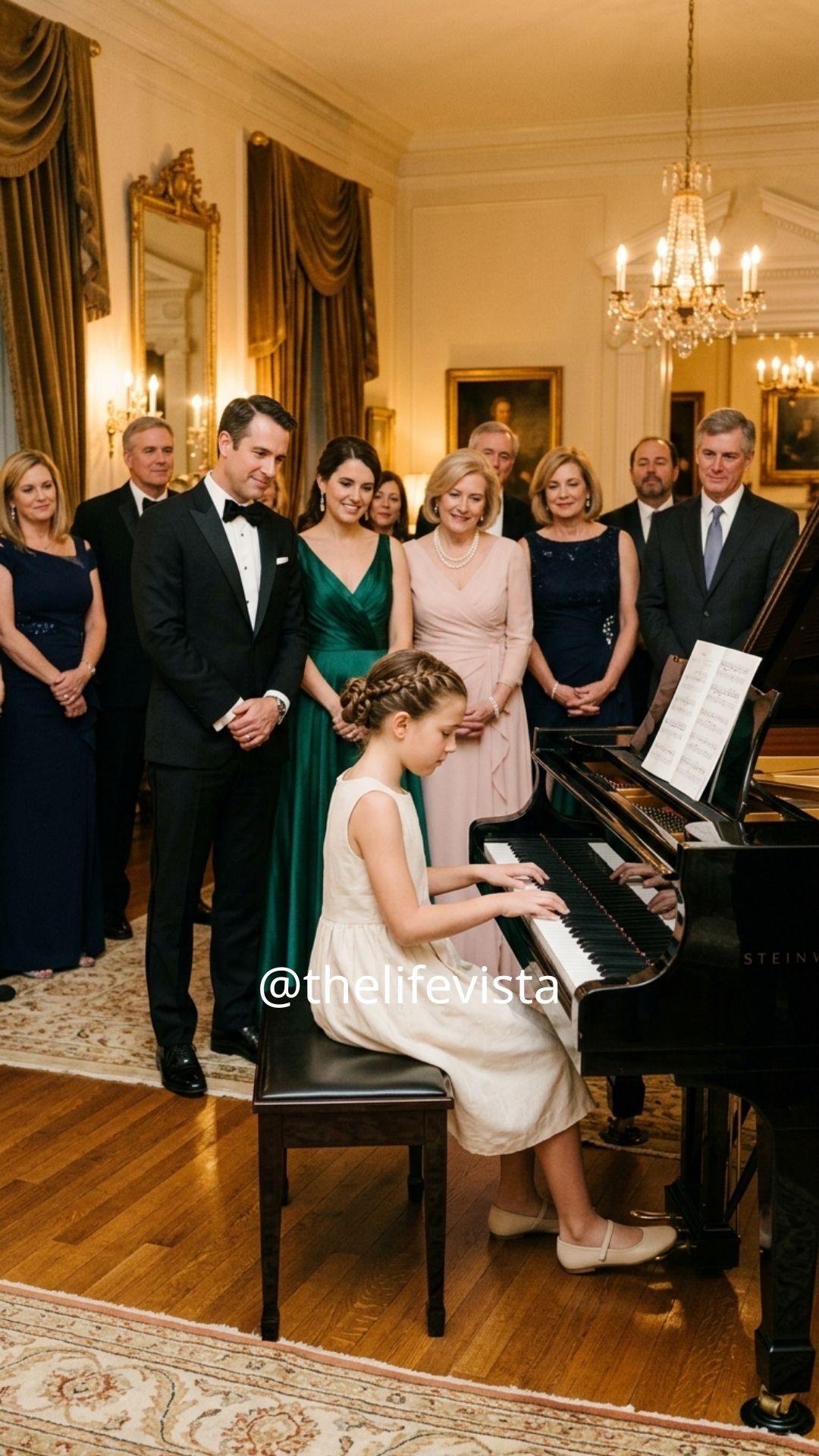 The same guests who had questioned her presence now leaned in to ask about her dreams, their earlier discomfort replaced with curiosity and admiration. A woman who had once murmured disapproval now asked what composers she liked best. A man who had laughed quietly earlier offered to donate additional funds in her name. Conversations shifted from polite detachment to genuine engagement, as if her music had cracked open something previously sealed.