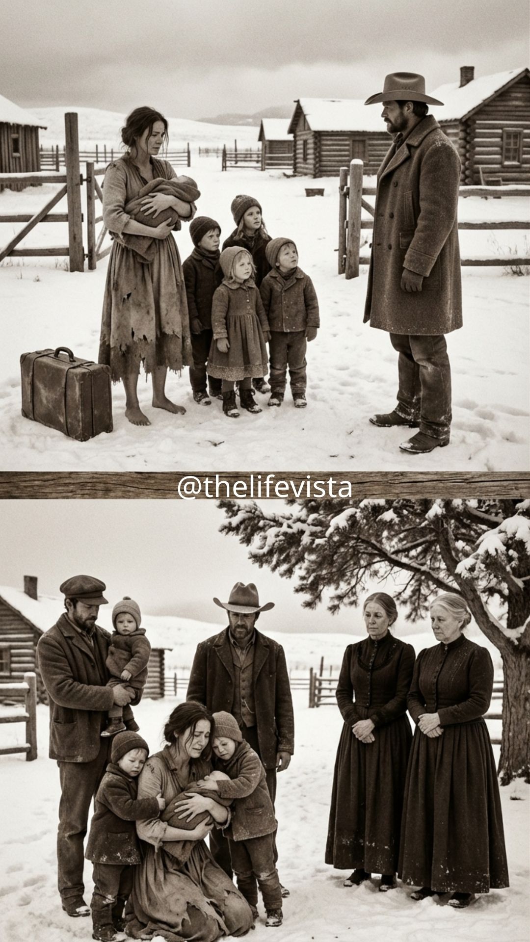 Madeline counted them the way she’d counted them every morning on the road, every night in the coach’s cramped darkness, every time fear tried to tell her she’d already lost one and simply hadn’t noticed. Nine. Still here. Still hers. And then she felt it: the stares. Not the curious kind you get when you arrive in town with baggage and mud on your hem. These were the stares people saved for a hanging, for a fire, for a funeral procession. Faces in doorways, eyes behind frosted windows. A man on the boardwalk spat into the snow as if the sight of Madeline’s children had soured his mouth.