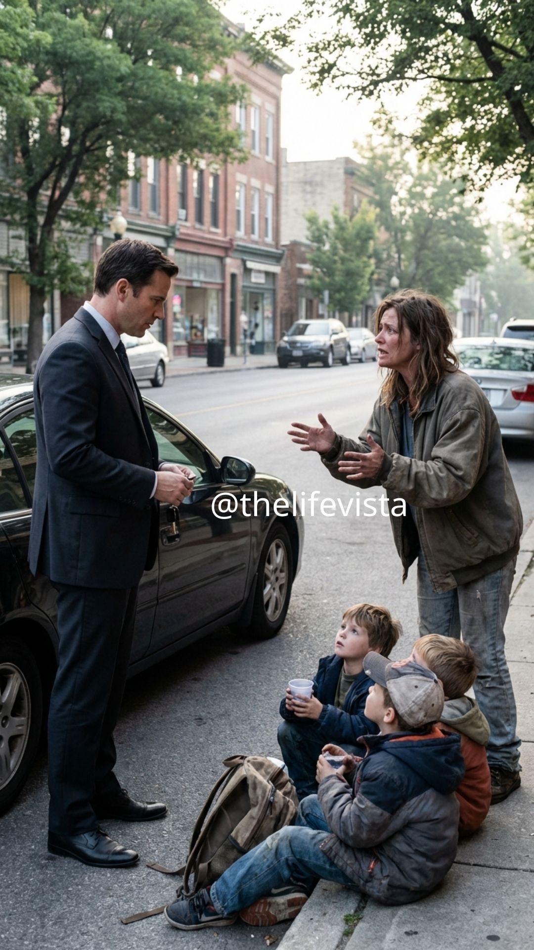 The city shimmered under a wash of golden sunlight that morning when Ethan Walker, a self-made millionaire at thirty-six, stepped out of his sleek black Maserati and adjusted the cuff of his tailored jacket while preparing to cross the busy downtown street. The day looked ordinary to everyone else passing by, yet something about the air felt strangely heavy, as if life was quietly preparing to place an unexpected turning point directly in his path. He had an important meeting scheduled in a glass tower several blocks away, one that involved investors and contracts worth millions of dollars, but fate had something far more unexpected waiting for him. As he crossed a crowded intersection filled with honking cars, impatient drivers, and hurried pedestrians weaving through traffic lights, something suddenly caught his attention and stopped him in his tracks.