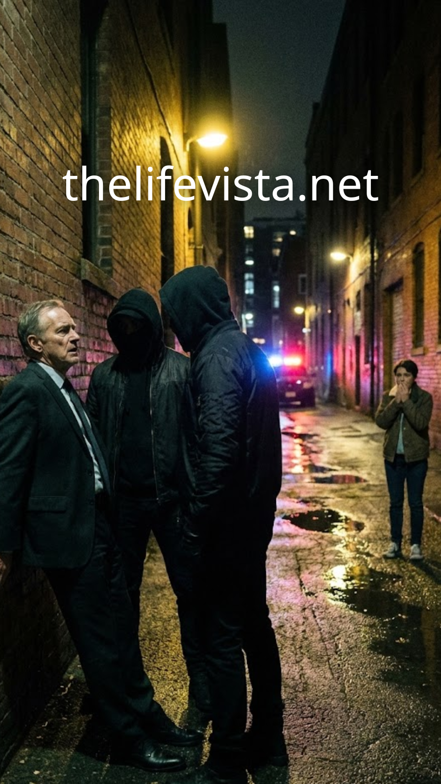 In the dim glow of a streetlamp, she saw two men pinning an older gentleman against the brick wall. His suit was wrinkled and stained from the struggle, but even through the grime it was clearly expensive. His silver hair caught the weak light, and a leather briefcase lay at his feet—an unmistakable symbol of wealth. The men shouted threats, demanding money and valuables, their voices harsh and urgent.