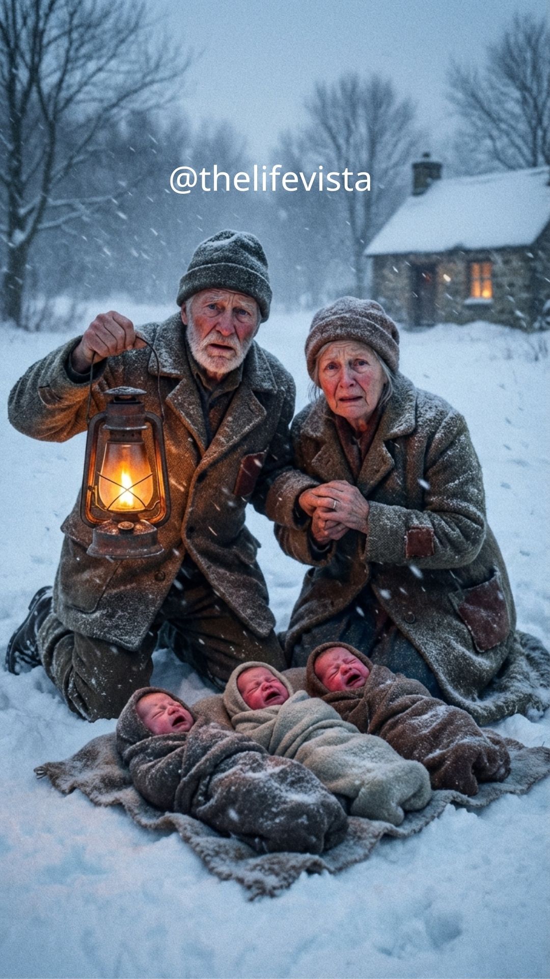 He stepped into the freezing storm, the wind slicing through him as the beam of light cut shaky paths through the snow. Laura followed close behind, clutching her shawl as fear and hope tangled in her chest. The light landed on a small wicker basket beside their gate, half-buried in snow. Inside were three newborns, wrapped in thin blankets soaked through with cold, their tiny faces red and trembling.