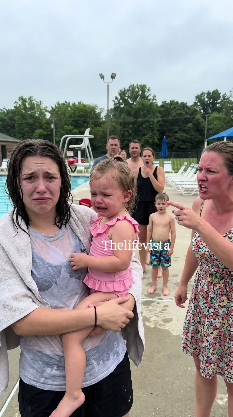 Because the girl’s mother came charging across the pool deck like a storm. “Don’t touch my child!” she screamed. Her voice cut through the entire pool area, sharp enough to make everyone freeze.