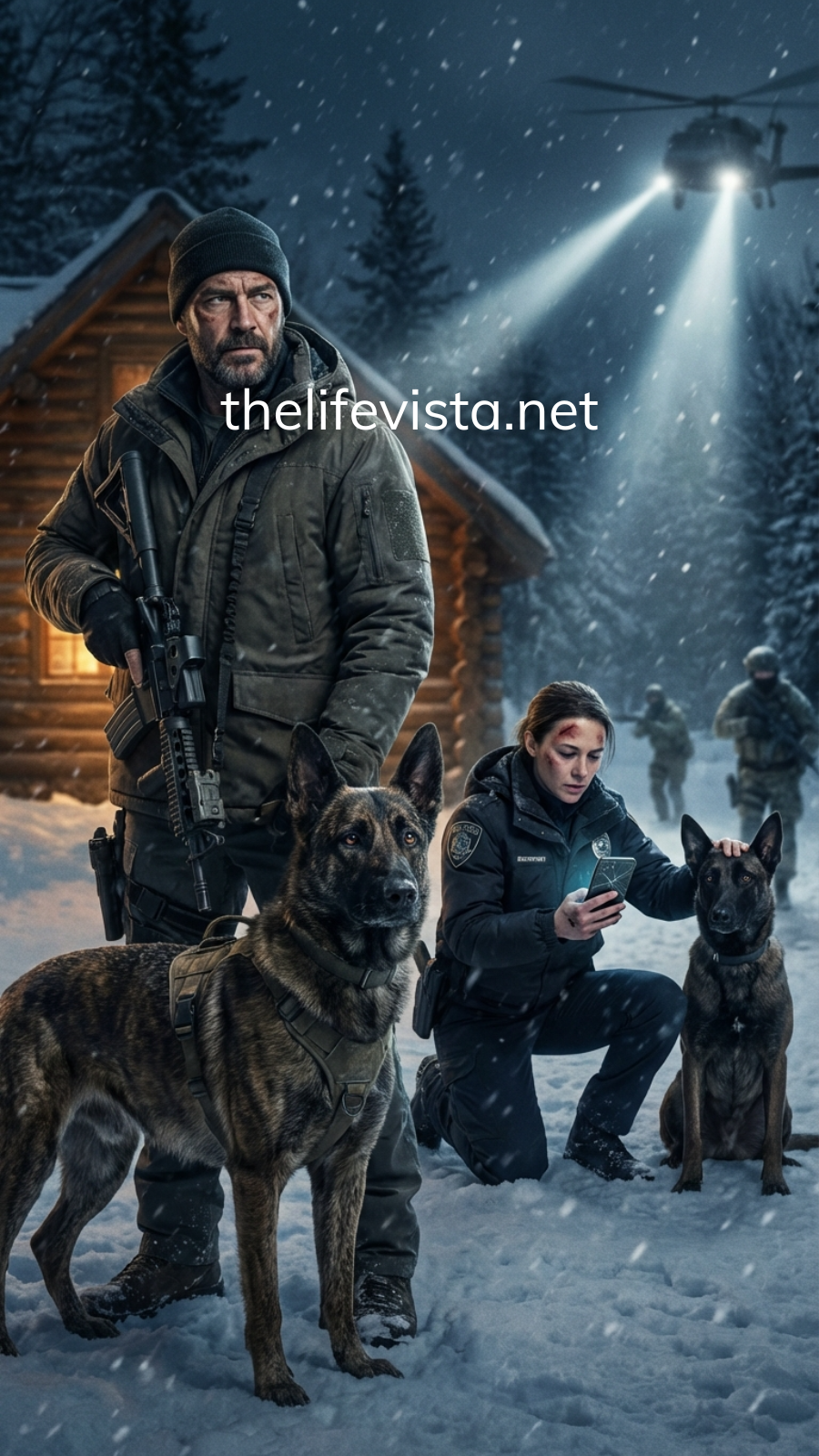He moved instantly—cutting the straps, lowering her carefully, checking pulse, airway, breathing. Hypothermia and a head injury. She was alive, but barely. Titan hovered over her, growling at every shadow until Ranger stepped between them and both dogs settled into a tense, wary truce.