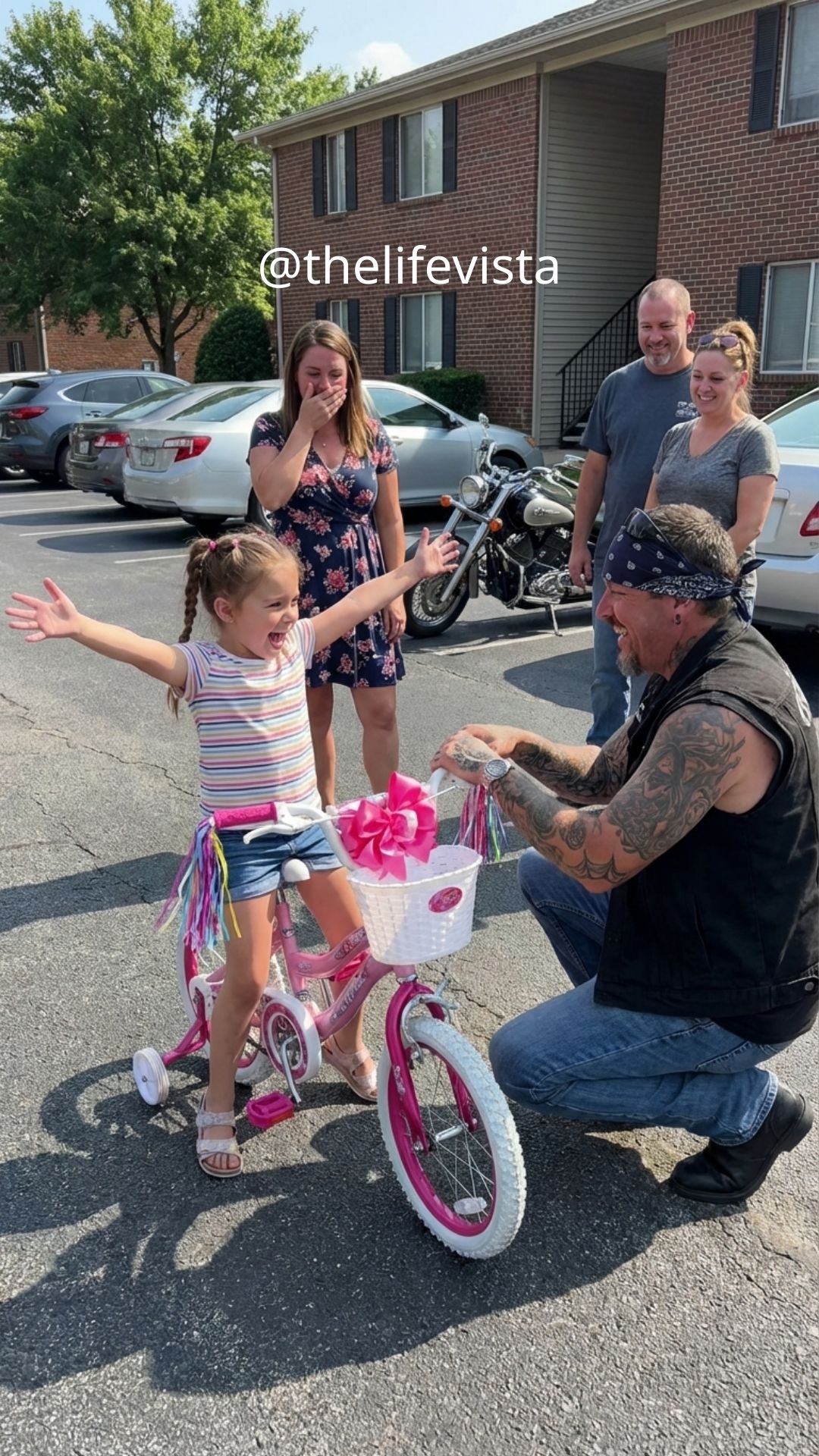 They stayed to teach her to ride, jogging alongside her as she wobbled and squealed, their heavy boots pounding the pavement with surprising gentleness. They stayed to cheer every small victory, every shaky pedal forward. They stayed to make sure she felt seen, celebrated, and safe. They stayed long enough that the neighbors stopped recording and started clapping, long enough that the afternoon sun dipped low and painted everything in gold.