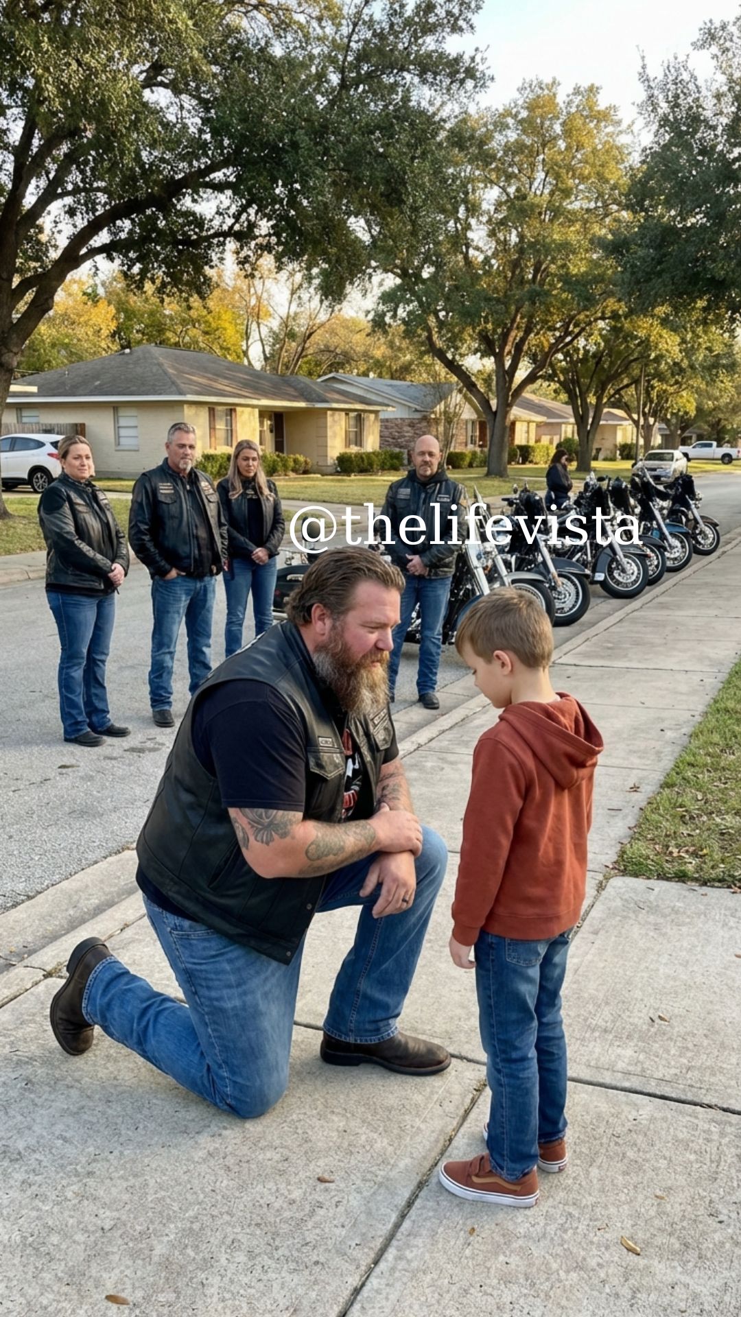 Grant stepped away from his bike, boots heavy against the asphalt. The others followed his gaze and fell quiet. These men had lived hard lives. They had seen accidents, heartbreak, long nights, and longer roads. But something about that boy—about the way his eyes searched their faces—cut through every rough layer they carried.