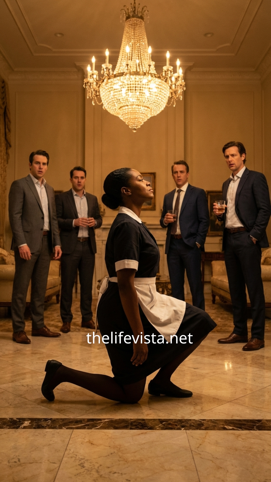 Laughter echoed through the polished marble living room of the Whitmore estate. Crystal glasses clinked together as guests toasted, soft jazz drifted through the air from hidden speakers, and the heavy scent of cigars blended with expensive whiskey. It was one of those nights where wealth felt like a performance.