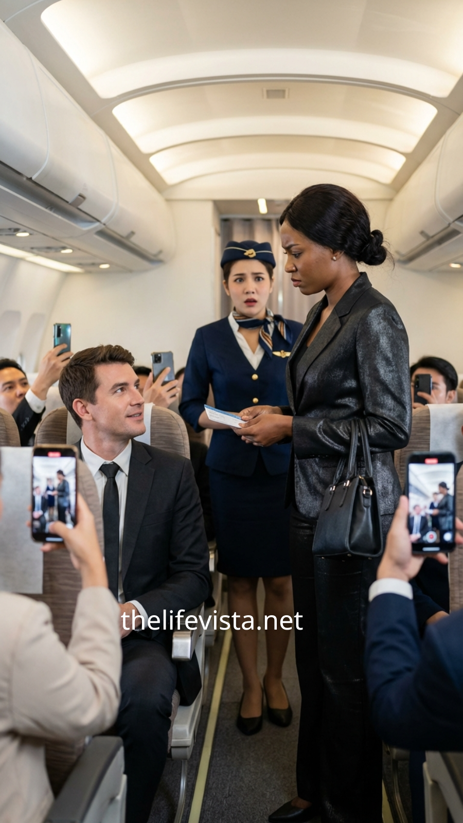 The first-class cabin suddenly grew quiet. A few nearby passengers turned their heads. Others pretended not to notice but listened closely.