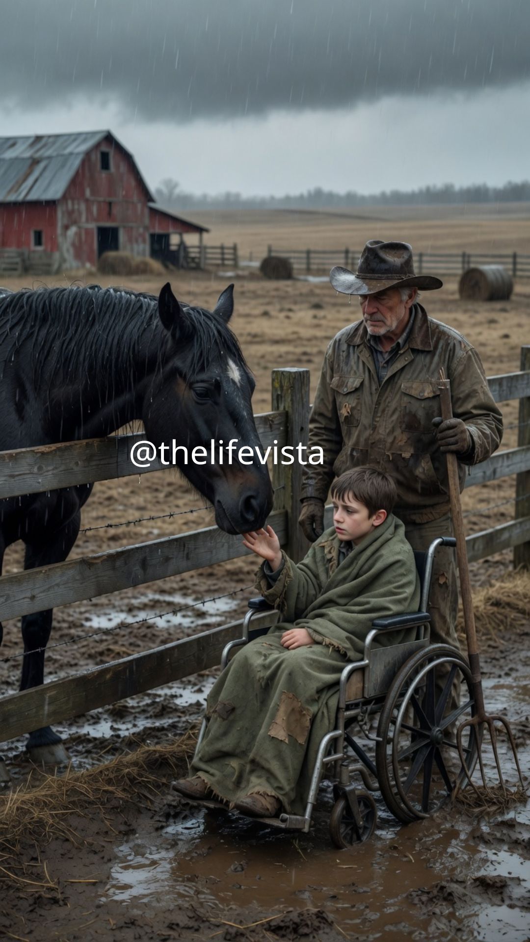 Yet there he was — small, impossibly fragile — sitting in a wheelchair that had already sunk halfway into the muck. It looked as if the earth itself was trying to pull him down before his time had fully come. I remember the exact moment my grip loosened on the pitchfork. It slipped from my hands and hit the ground with a dull, wet thud, but I barely registered the sound.