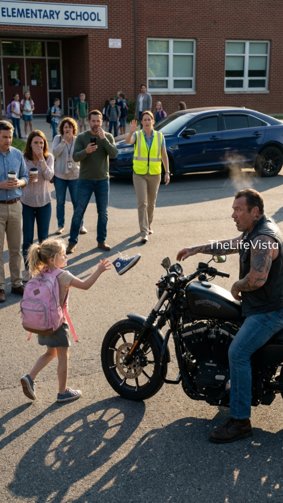Mid-forties, broad-shouldered, sleeveless leather vest, arms marked with tattoos. He carried a presence that made conversations soften without reason. At first, only a few parents noticed him. Then more did. Their glances lingered.