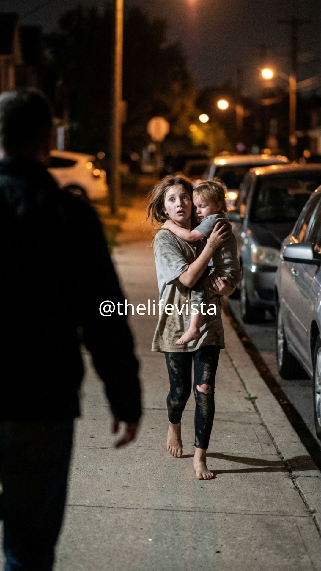 She struggled to balance, arms wrapped tightly around something she held against her chest with a determination that looked far too serious for a child so small. The way she protected what she carried suggested she had been holding it for a long time, refusing to let go even as exhaustion threatened to pull her down. My heart pounded harder with every step she took toward the road, and a terrifying realization began to form inside me like thunder building before a storm.
