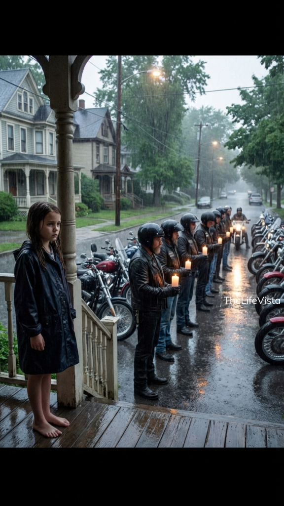 Outside, the riders dismounted in silence. Leather jackets darkened by rain, boots striking pavement with muted weight. They didn’t gather in clusters or greet one another loudly. Instead, they formed a loose line along the sidewalk in front of Ava’s house, spaced evenly, facing forward.