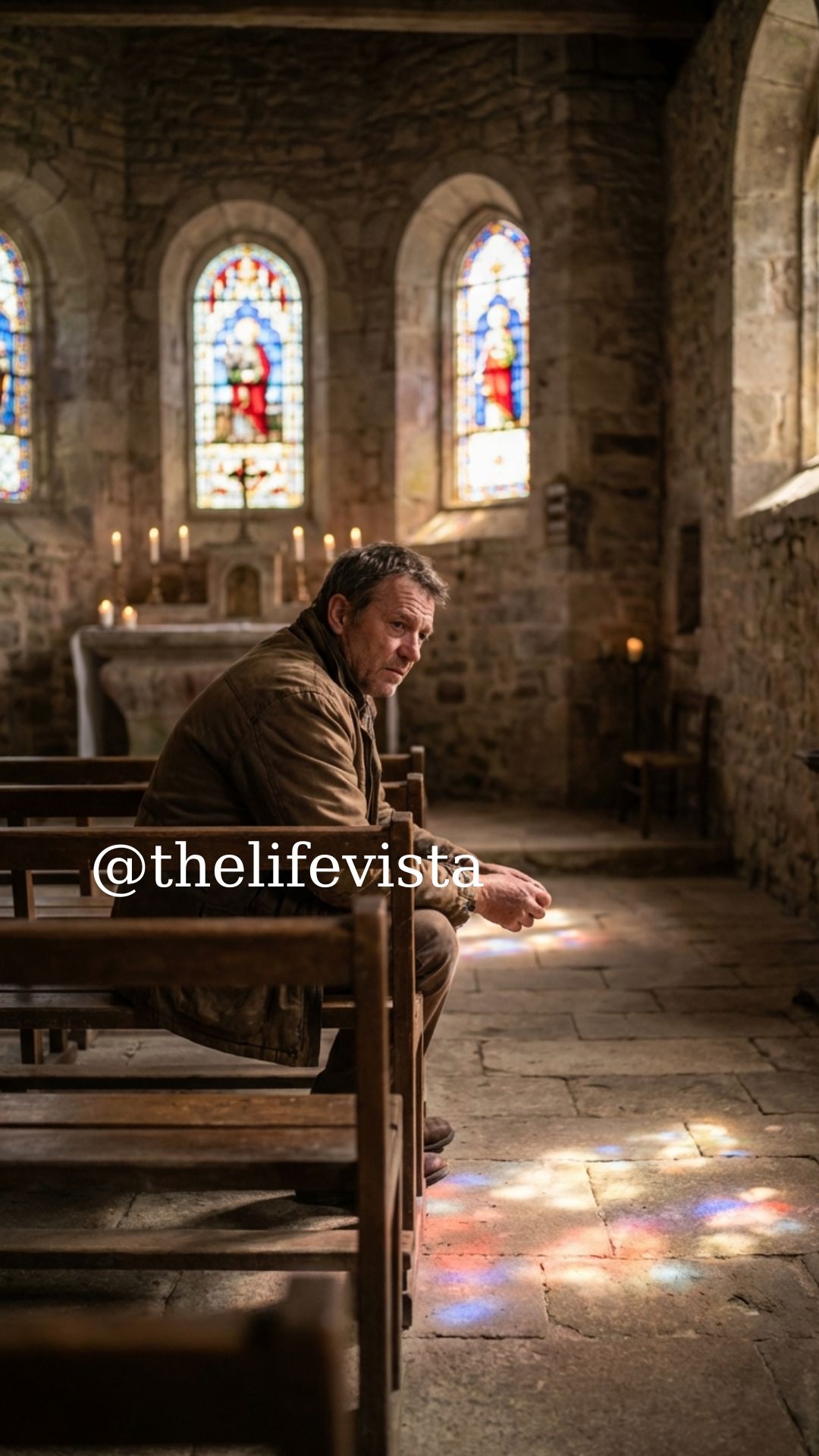 Not the empty kind of quiet, but a deep, living stillness. The smell of old wood and candles filled the air. Sunlight filtered weakly through stained glass windows, painting soft colors on the floor.