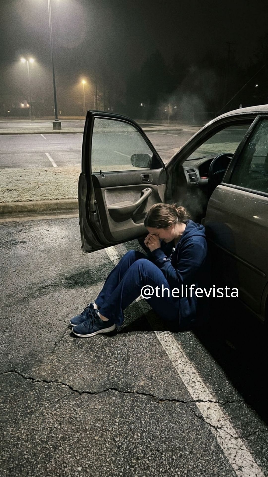 She reached the door and placed her hand on it, but something in her stopped. Instead of getting in, she slowly sat down on the cold pavement, still in her scrubs, and let herself fold inward.