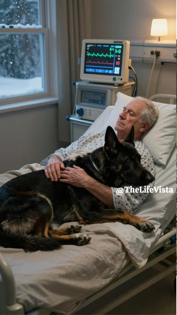 Hospitals pretend to sleep at night, but after midnight they don’t rest, they confess, and while the building hummed with machines and tired footsteps, Ranger never left my side. Not when nurses rotated shifts, not when security stood outside my door pretending they were there for my safety rather than for the dog’s containment, not when the lights dimmed and my body tried to drift into the kind of sleep that feels too much like surrender. He lay so close to my bed that his breathing became a second rhythm beneath my own, and every time my heart stumbled even slightly, his ears twitched as if he were listening for something only he could hear, something deeper than sound.