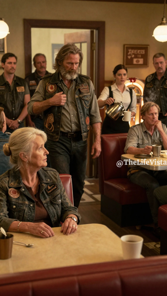 Every head in the diner turned at once, but not toward the bikers. They turned toward the speaker. An elderly woman sat upright in her booth, hands resting calmly on the table. Her silver hair was pulled back into a tidy knot, and her expression held neither fear nor challenge. She was simply looking at the largest man among them as though she had just asked him for the salt.