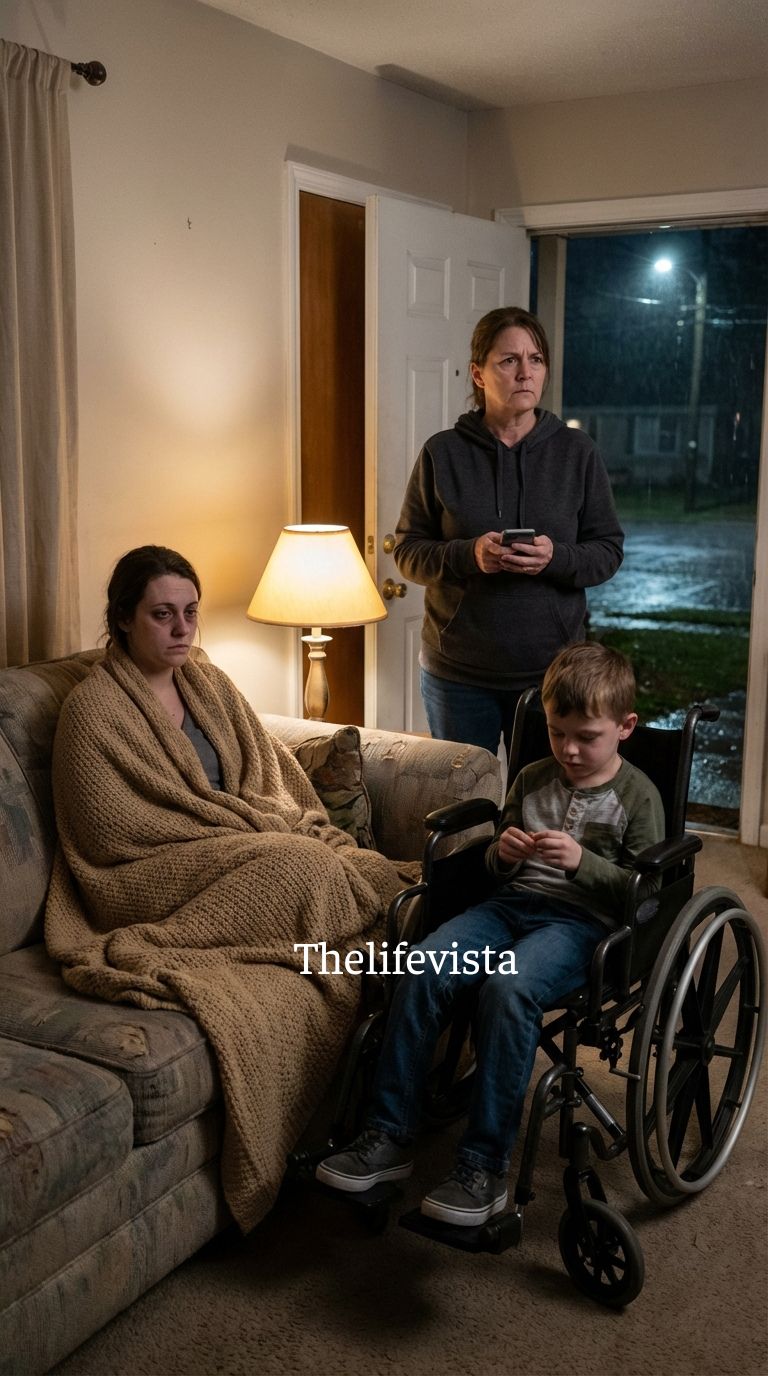 Her hair was plastered to her face with rain and blood, her cheekbone swollen and darkening fast, one eye nearly closed, her body angled protectively around her son, Luxen, whose wheelchair was tilted awkwardly as if she’d dragged it through hell to get here, his small hands locked rigidly around the armrests, his breathing quick and shallow but quiet, because Luxen had learned early that noise often made things worse.