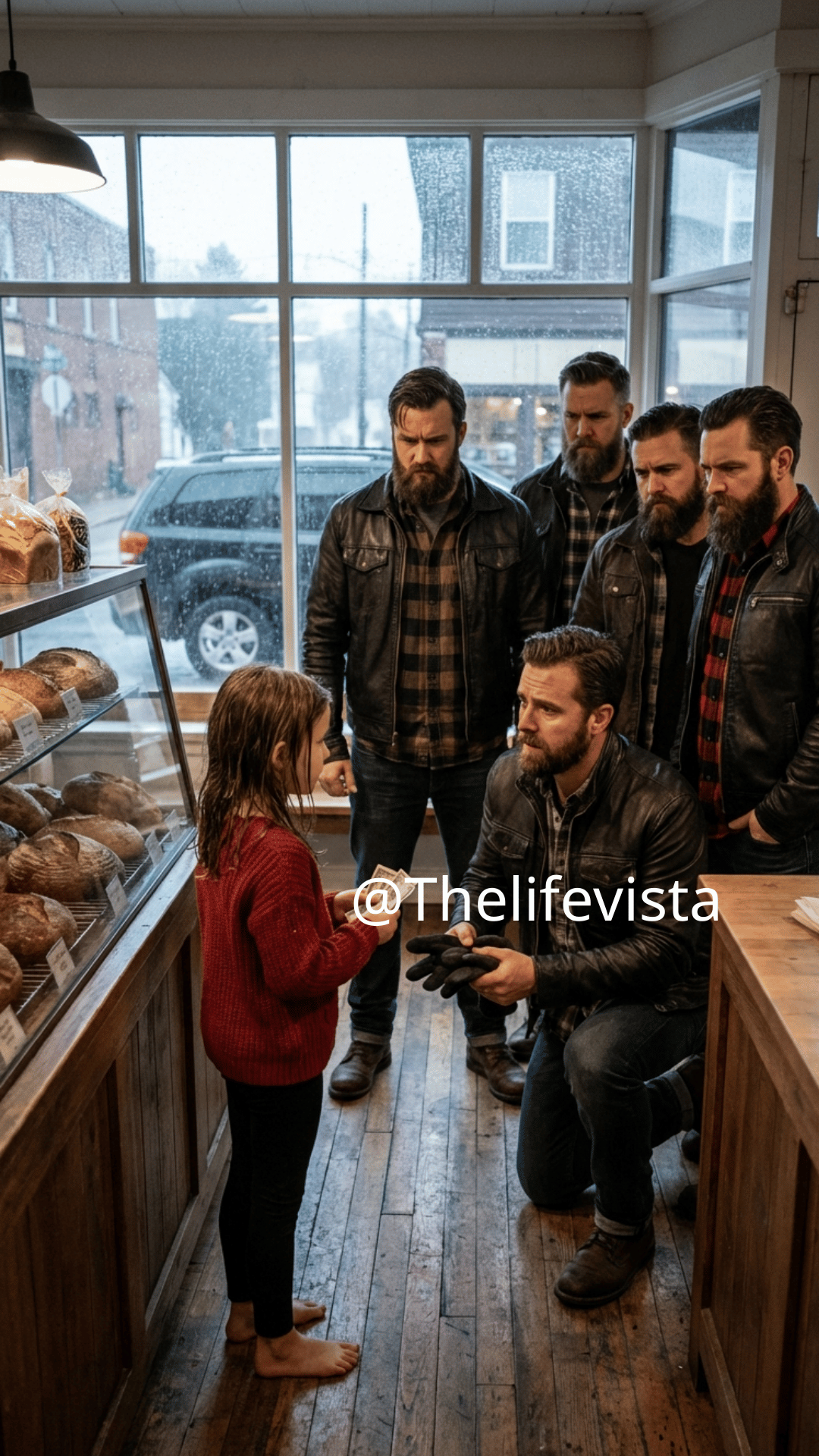 At dawn, an eight-year-old girl walked barefoot into a small-town bakery, her hands stained red as she quietly begged for a piece of bread. When a man stormed in behind her, insisting it was a “family matter,” six veterans sitting nearby rose without a word and formed a barrier between the child and the door. None of them realized that this silent act of protection would alter the course of her life forever.