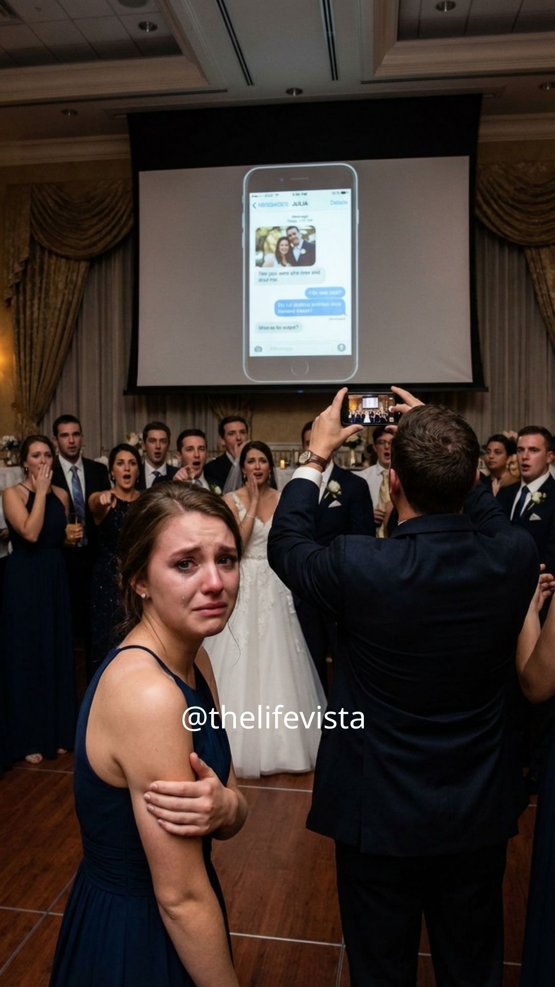 Lucas faced the guests, his voice steady but sharp. “Before this wedding continues, everyone deserves to know the truth.” My heart pounded as he reached into his jacket, and in that moment I realized this wasn’t an accident. This was a reckoning. He pulled out his phone and connected it to the large screen behind the altar, the one meant for wedding photos. Instead, text messages appeared, and gasps rippled through the crowd.