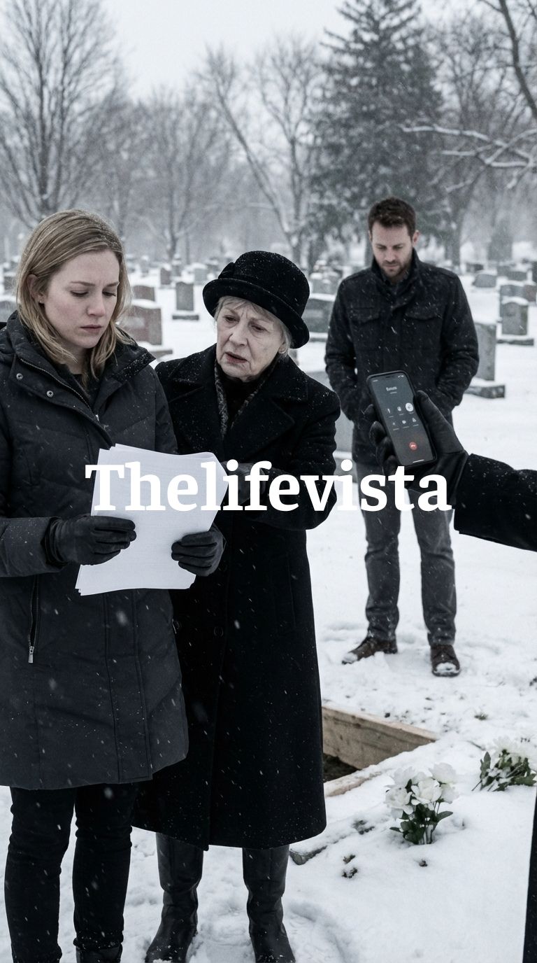 Snow flurries drifted across the cemetery—soft, slow, indifferent—while the sky hung low like a heavy lid trapping breath and life beneath it, and beneath that sky a mound of dark, wet earth rested atop the small pink casket they had just lowered into the ground, a casket too small to exist in a world where mothers believe their children will always outlive them.