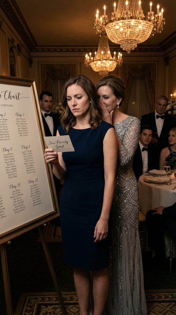 I opened my phone. My thumb hovered over Tessa’s name. I started typing, *maybe I went too far*. Then I stopped. Pulled up the screenshot from three weeks ago. *Family adjacent.* Looked at the place card I’d kept in my handbag, still sitting on my nightstand like a small monument to everything wrong with us. *Non‑priority guest.* Linen card stock. Beautiful penmanship. My name above a demotion.