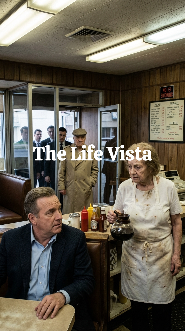 Behind him, Arthur slowly lowered his cup. Before I could step away, before the words in my throat could turn into something regrettable, the diner door slammed open so hard it rattled the windows. Four men entered, all in dark suits, alert and imposing, scanning the room like they owned it. Conversations died instantly. Even the grill seemed to quiet.