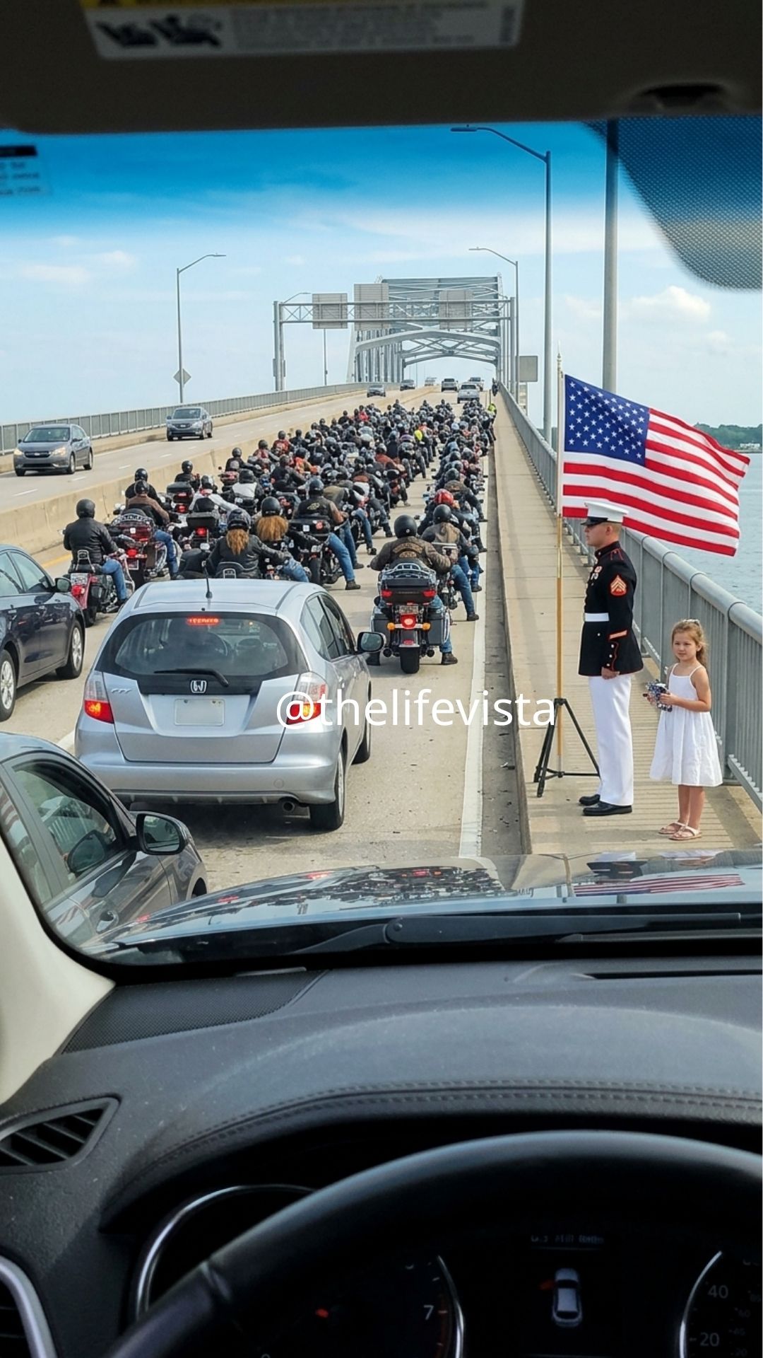At first it felt like vibration through the frame of the cars, a low tremor that drivers mistook for a heavy truck shifting gears. Then the rumble deepened, multiplied, and sharpened into something unmistakable: motorcycles. Not one or two weekend riders, but dozens of engines revving in synchronized thunder, an organized growl that rolled forward like a storm front crossing steel. Heads turned. Mirrors adjusted. Windows rolled halfway down despite the heat. The bridge, which had been nothing but a slow-moving annoyance seconds earlier, suddenly felt like a stage where something serious was about to happen.
