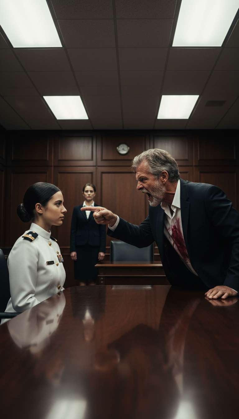 The words echoed in the quiet conference room like a slap. Maria Holt stood rigid beside the long oak table, her Navy dress blues pressed so sharply they could cut glass. Across from her, her father—Robert Holt—leaned forward, jaw tight, eyes burning with a familiar mixture of entitlement and contempt.