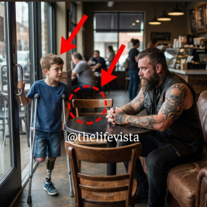 A 10-year-old boy with a prosthetic leg limped into a busy coffee shop, rejected by every table he approached. When he finally stopped in front of a tattooed...