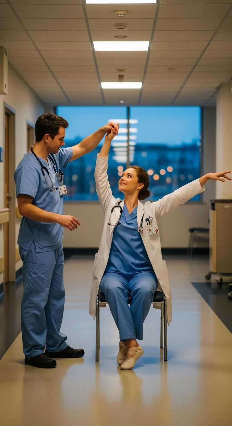 “Left, left,” she’d whisper, and they’d laugh and correct and collide on purpose, and somewhere not far away in a quiet room, a chart with a patient’s name on it would wait for morning, and a maintenance closet would smell like lemon, and the city would glitter the same way it had the first night he asked.