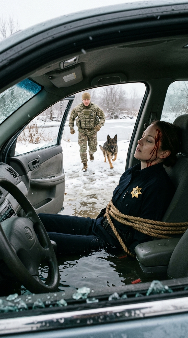 Under the surface, headlights stared like ghost eyes. A patrol SUV was sinking nose-first, bubbles pouring from the seams. Miles kicked hard, fighting the pull of mud and panic, and reached the driver’s side.