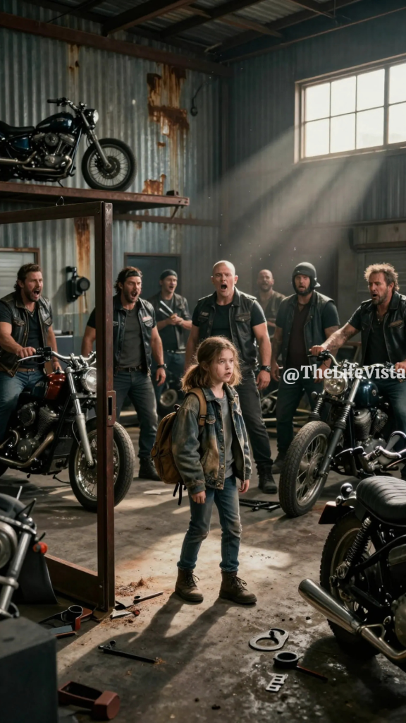 She stood in the doorway like she was deciding whether to step forward or run, small frame, worn sneakers, a backpack that looked like it had been dragged through more miles than any kid should have to count. Her hair was pulled into a messy ponytail, and her jacket was two sizes too big, sleeves rolled up so she could use her hands without drowning in fabric. She did not smile, and she did not ask permission to be there, which made the men watch her harder. Rory was the first to really notice her, because he was closest to the door and because he had been elbow-deep in a paint job, custom flames licking up the side of a fuel tank. He glanced up with the brush still in his hand and gave her a look that wasn’t exactly welcoming, the kind of look that asked what trouble she was bringing into their day.