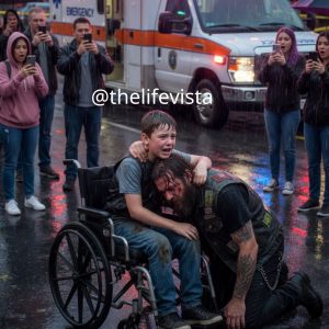 On a cold, rainy night outside a packed emergency room, a silent biker suddenly ripped off his helmet and slammed it against the hospital doors. People stepped back, thinking a fight was about to break out. But seconds later, the phone call he made left even the security guards standing frozen.