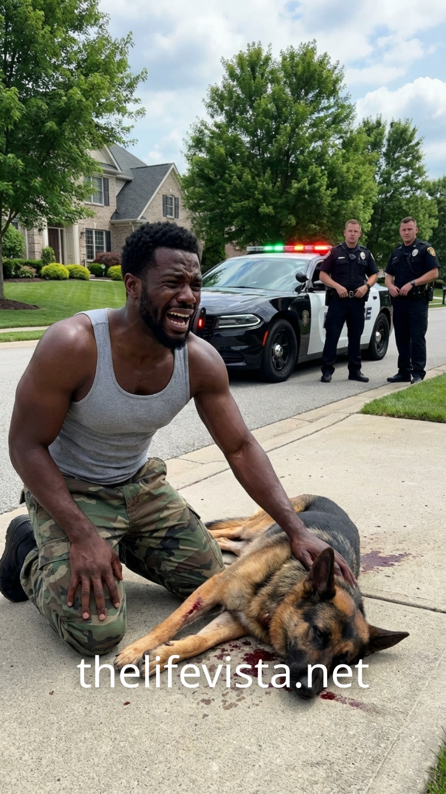 Darius dropped instantly to his knees, gathering the German Shepherd’s head into his hands. His voice softened as he whispered to the dog, trying to comfort him even as life faded from his loyal companion.