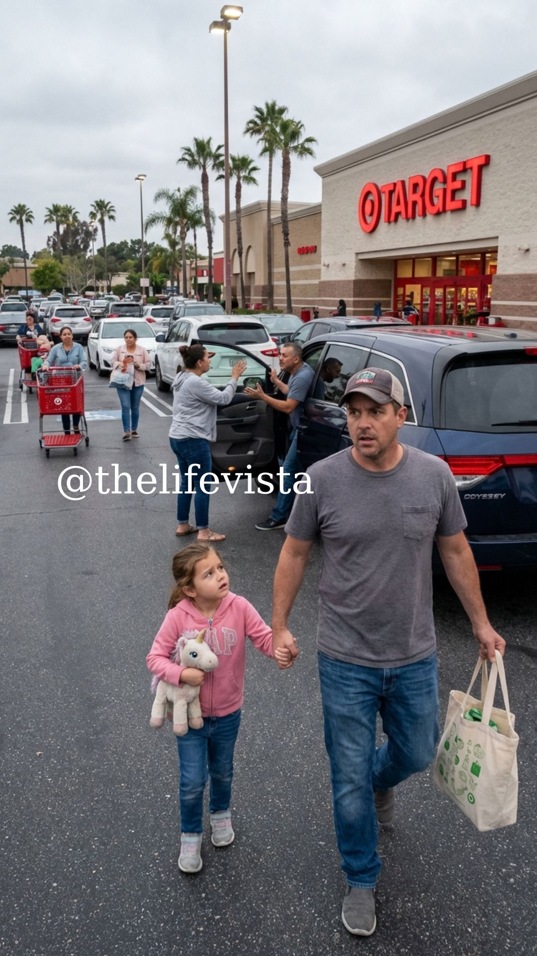 Logan Pierce exited the grocery store carrying two canvas bags in one hand and holding the small, warm hand of his daughter Ava in the other, her backpack slipping off one shoulder as she skipped beside him, humming a tune she’d learned in music class, blissfully unaware that her father’s mind was already scanning the environment out of habit more than intention.